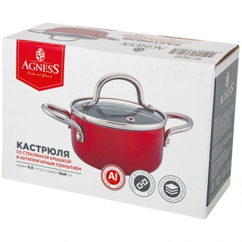 Кастрюля agness 12*6 см 0,6 л с антиприг покрытием, стекл крышкой, красный металлик Agness (936-203)
